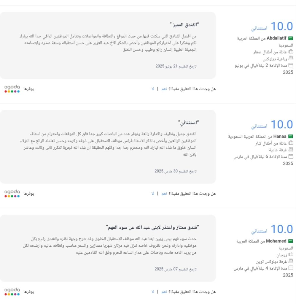 “فندق ممتاز واستثنائي” و”سيتم تكرار الزيارة”، بهذه الكلمات وغيرها من عبارات الثناء يصف نزلاؤنا تجربتهم في أبراج الهدية. نحن نفخر بالتقييمات العالية التي حصلنا عليها، والتي تعكس التزامنا بتقديم خدمة لا تشوبها شائبة. فسواء كنتم تبحثون عن حجز فنادق مكة لرحلة العمرة القادمة أو تخططون لإقامة عائلية، فإننا نقدم لكم عروض عمرة تنافسية وقيمة لا تضاهى.لا تتردد في أن تكون جزءاً من تجربة أبراج الهدية.